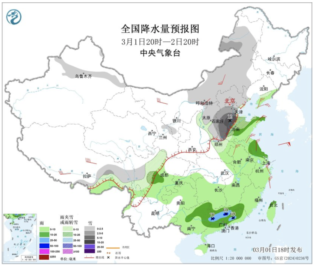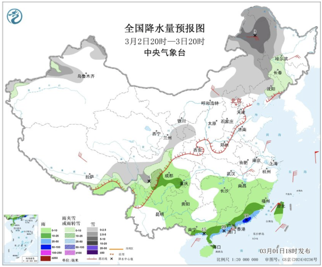 中央气象台预计,3月1日20时至2日20时,江淮东部、江西南部、福建西南部、广东大部、广西东部、四川盆地西南部等地部分地区有中到大雨,其中,广西东部、广东中北部等地局部地区有暴雨。