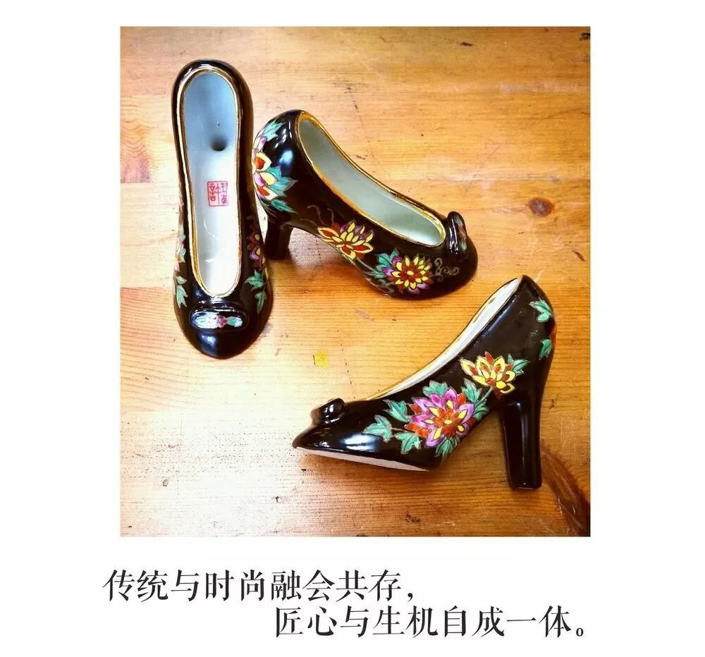 许珺茹自己创作的作品也赢得广泛好评。“落雨大,水浸街,阿哥担柴上街卖,阿嫂出街着花鞋,花鞋花袜花腰带......”这首广东地区流传甚广的童谣,伴随着许珺茹的童年成为珍贵的回忆,也成就了这件充满奇思妙想的广彩作品——《落雨大,着花鞋》。这双她设计的“广彩高跟鞋”结合了高跟鞋造型、广彩技法、绣花鞋纹样,在当时的广府庙会一出场就成为了引人注目的“大明星”。